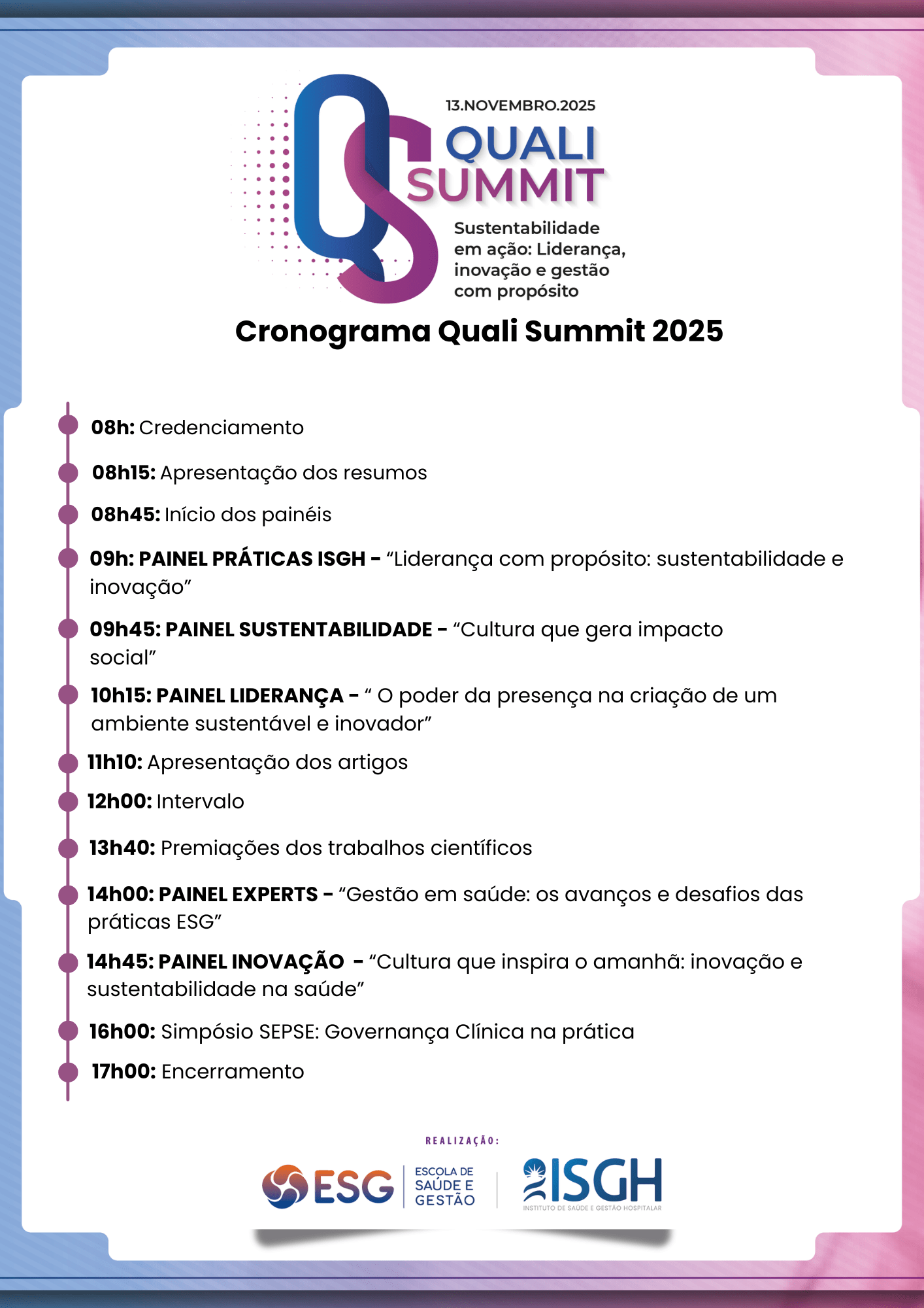 O Quali Summit 2025 é realizado pelo Instituto de Saúde e Gestão Hospitalar (ISGH) e a Escola de Saúde e Gestão (ESG), com apoio da Federação das Indústrias do Estado do Ceará (FIEC), Associação Médica Cearense (AMC), SOPAI e INOVAMED.